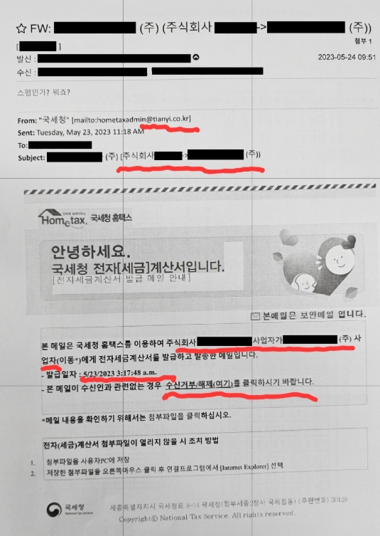 최근 “국세청”을 사칭해 “전자세금계산서입니다”라는 메일이 뿌려지고 있다는 경고가 잇따르고 있다. 특히 최근 국내 한 대형 유통사의 고객 정보 유출 사건 이후, 유출된 메일 주소를 대상으로 국세청을 사칭한 스팸‧피싱 메일이 대량 유포 중이라는 보도가 나왔다.