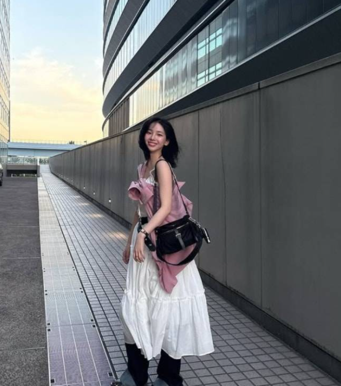 이번 패션 포인트는 ‘감각적인 믹스매치’입니다. 화이트 롱 스커트라는 베이식한 아이템 위에 레드 깅엄 체크 셔츠를 매치하여 캐주얼하면서도 사랑스러운 분위기를 연출했습니다. 허리 리본 장식, 어깨 퍼프 디테일 등으로 포인트를 주며 청순하면서도 스타일리시한 모습을 완성했죠.