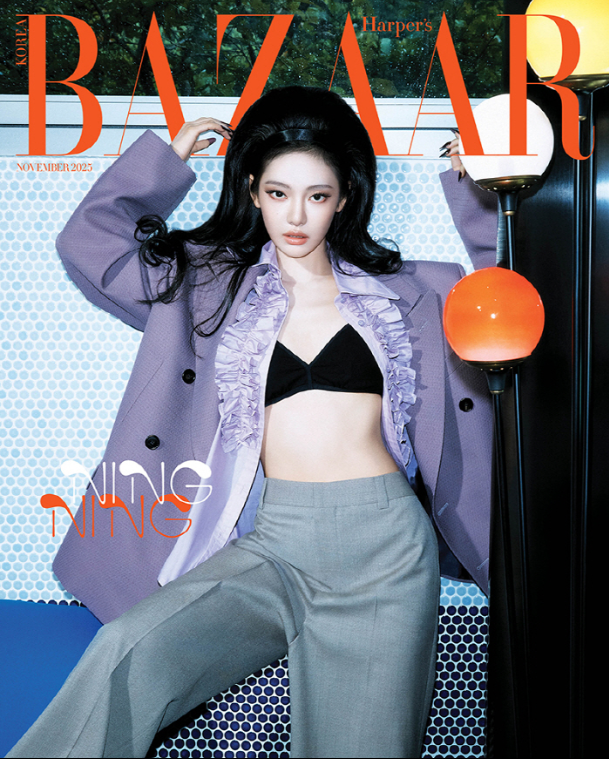 패션 매거진 화보에서도 닝닝은 과감함을 이어갔습니다. 최근 『Harper’s Bazaar Korea』 화보에서는 속옷 느낌이 나는 톱 또는 브라탑 스타일에 재킷 등을 레이어드해 ‘시크함+섹시함’을 동시에 잡은 콘셉트를 보여주었어요.