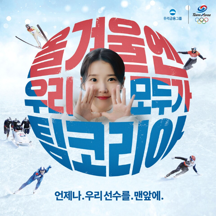 우리금융그룹은 동계올림픽을 앞두고 ‘대한민국 국가대표 금융그룹’ 광고를 선보였다. 이 광고에서는 아이유의 목소리와 얼굴을 전면에 내세워 선수들을 응원하는 메시지를 전달한다. 광고 속에는 경기장, 일상 곳곳에서 선수들을 응원하는 국민의 모습이 등장하고, 아이유는 내레이션을 통해 **“언제나 우리 선수를 맨 앞에”**라는 슬로건을 강조한다.