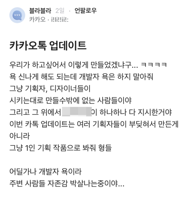 • 블라인드 등 내부 익명 커뮤니티에서는 개발자·기획자·디자이너가 모두 업데이트에 반대했지만, 고위층 지시로 강행되었다는 주장이 나왔어요.