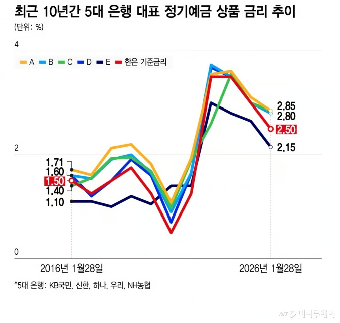 기사에 따르면 최근 5대 은행의 정기예금 상품에 10년간 재예치했을 때, 원금 100만원이 약 115만~120만원 수준으로 성장하는 것으로 나타났습니다. 이는 연평균 복리 수익률 기준 1.4~1.9% 수준으로 매우 낮은 수익률입니다.