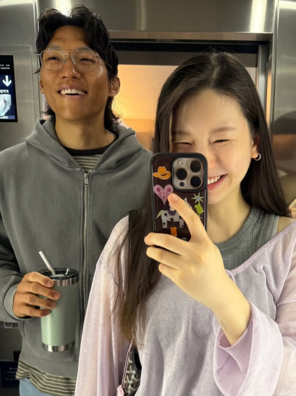 공개된 사진 속에는 일본 도심 한복판에서 여유롭게 시간을 보내는 두 사람의 모습과 창가에 서서 무지개를 바라보는 낭만적인 장면이 담겼다. 엘리베이터 거울 셀카와 식당 데이트 컷에서는 신혼 부부 특유의 달달한 기운이 물씬 풍겼다.