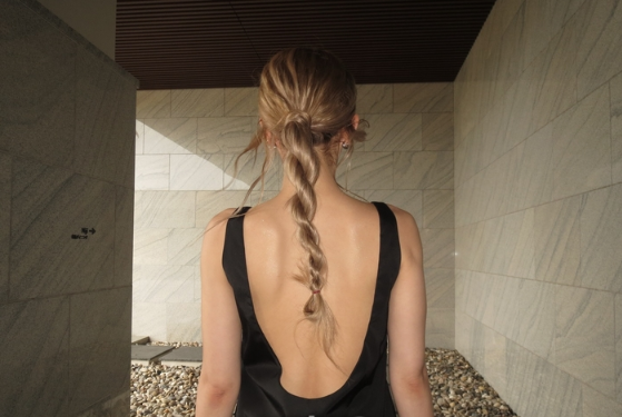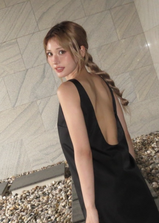 이번 스타일에서 가장 눈길을 끈 것은 단연 백리스 디자인이다. 등이 과감하게 드러난 구조는 단순한 노출을 넘어 세련된 실루엣을 강조하는 역할을 했다.