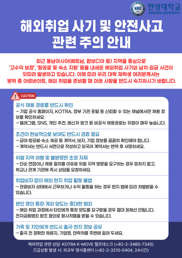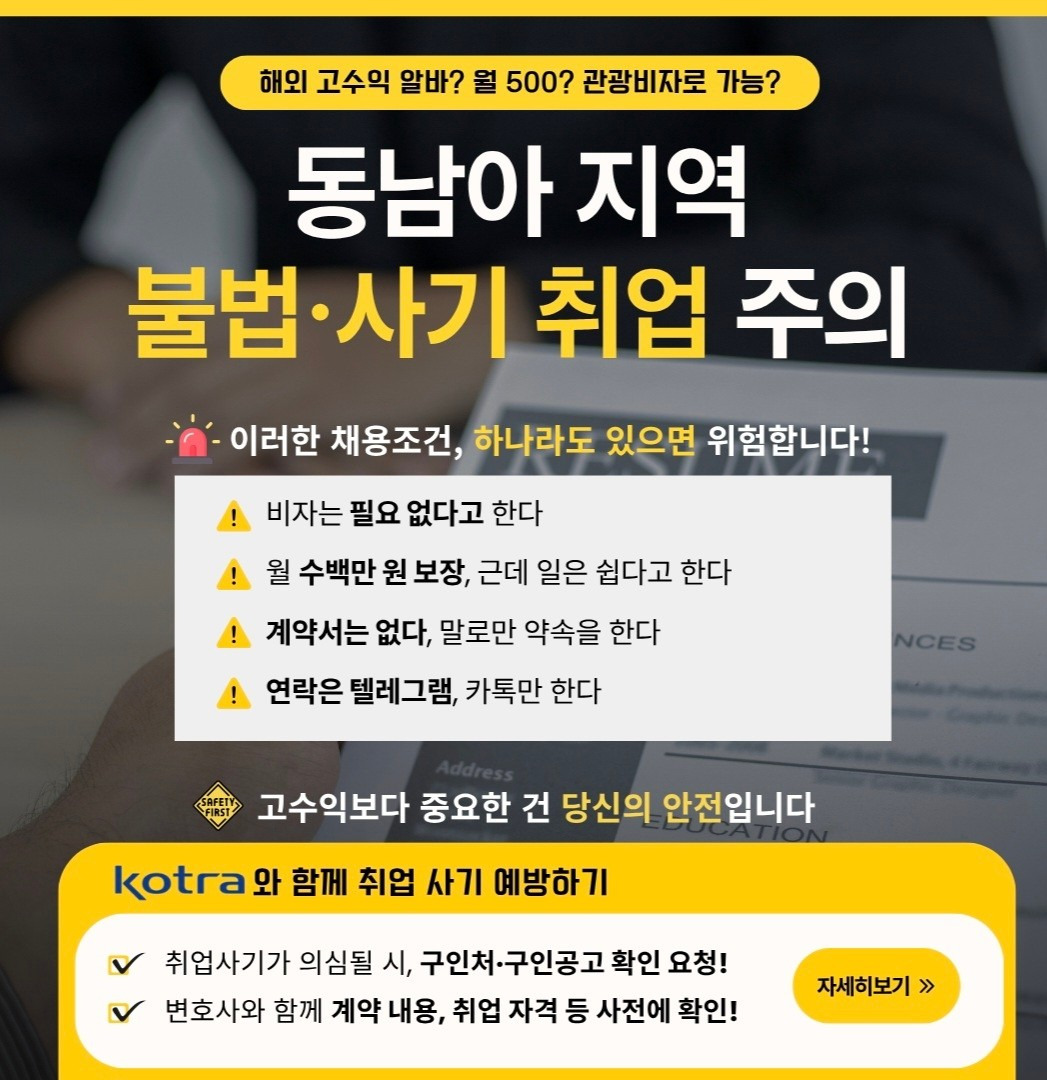 – 해외 통역, 취업 등의 제안을 받을 경우 먼저 가족이나 지인에게 상황을 알리고 확인하는 것이 중요합니다.